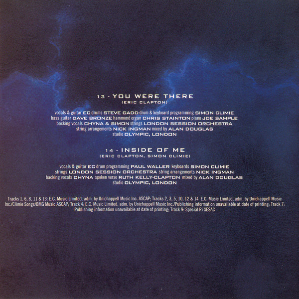 Arranged By [String Arrangements] – Nick Ingman Backing Vocals – Simon Climie Backing Vocals – Chyna Bass Guitar – Dave Bronze Drum Programming, Programmed By [Keyboards] – Simon Climie Drums – Steve Gadd Mixed By – Alan Douglas (2) Organ [Hammond Organ] – Chris Stainton Piano – Joe Sample Strings – The London Session Orchestra Vocals, Guitar – Eric Clapton Written-By – Eric Clapton |