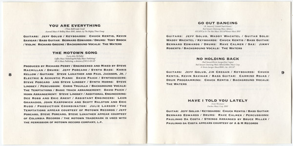 Backing Vocals – The Temptations Coordinator [Production Coordinator] – Julie Larson Drums – Jeff Porcaro Electric Piano, Piano [Acoustic] – David Paich Engineer [Additional] – Dee Robb Engineer [Additional] – Eric Anest Engineer [Assistant] – Leon Granados Engineer [Assistant] – Scott Ralston Engineer [Assistant] – John Karpowich Engineer [Assistant] – Eric Rudd Engineer, Mixed By – Steve Macmillan Guitar – Steve Lukather Guitar – Paul Jackson Jr. Keyboards [Bass] – Khris Kellow Percussion – Chris Trujillo Producer – Richard Perry Synthesizer – Steve Porcaro Synthesizer, Synthesizer [Horns], Arranged By [Horns] – Steve Lindsey (4) Written-By – Larry John McNally |