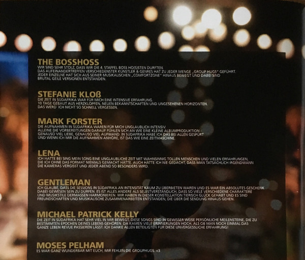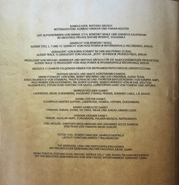 The BossHoss Arranged By – Sascha Vollmer Backing Vocals – Laura Bellon Backing Vocals – Katja Friedenberg Baritone Saxophone – Axel Müller (3) Bass – Dominik Krämer Drums – Mario Garruccio Electric Guitar – Markus Vollmer Electric Guitar – Daniel Stelter Harmonica – Malcom Arison Keyboards – Malte Horstmann (2) Keyboards – Mathias Grosch Music By – Philipp Steinke Music By – Daniel Nitt Music By, Lyrics By – Philipp Steinke Music By, Lyrics By – Simon Triebel Music By, Lyrics By – David Jürgens Music By, Lyrics By – Mark Cwiertnia Trombone – Franz Johannes Goltz Trumpet – Christoph Moschberger Vocals – Alec Völkel Vocals, Acoustic Guitar, Programmed By [Additional] – Sascha Vollmer |