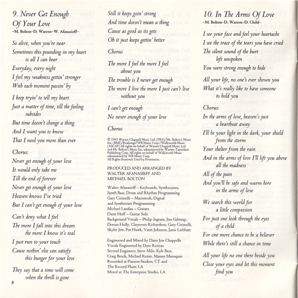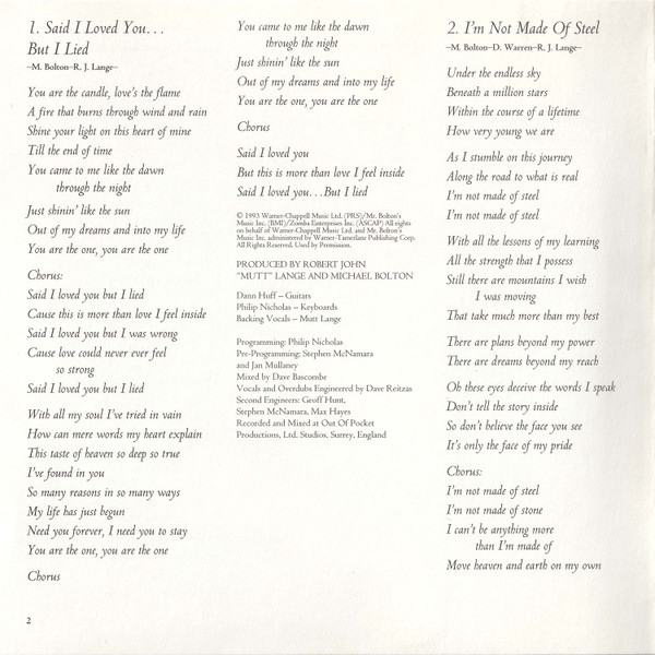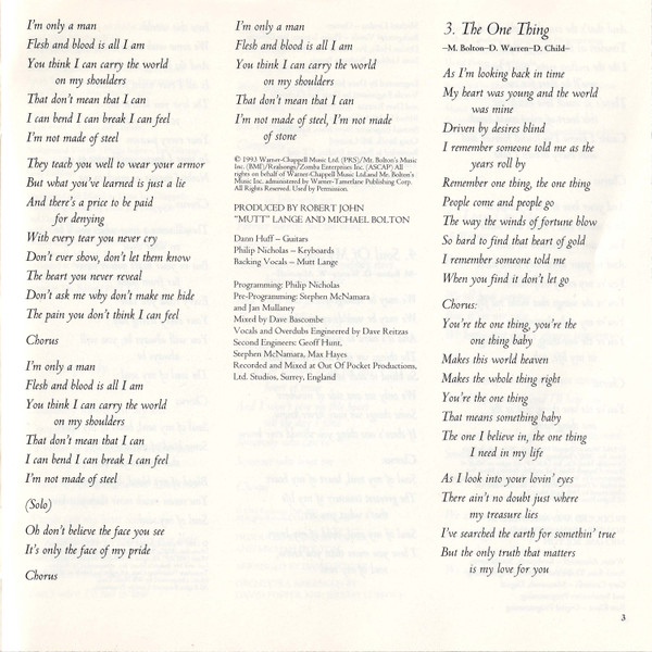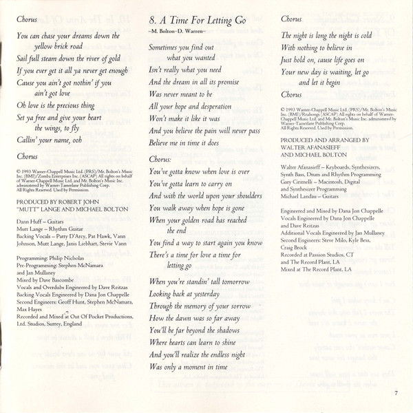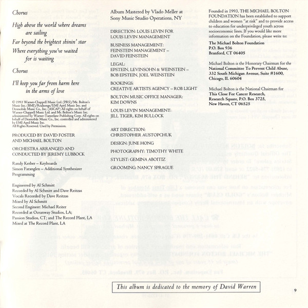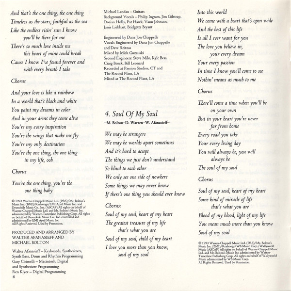 Arranged By – David Foster Arranged By [Orchestra] – David Foster Arranged By [Orchestra] – Jeremy Lubbock Drums – John Robinson (2) Engineer [Second] – Michael Reiter Guitar – Michael Thompson Keyboards – David Foster Mixed By – Al Schmitt Producer – Michael Bolton Producer – David Foster Programmed By [Synthesizer] – Claude Gaudette Recorded By – Humberto Gatica Recorded By – David Reitzas Recorded By [Vocals] – David Reitzas Written-By – Diane Warren |