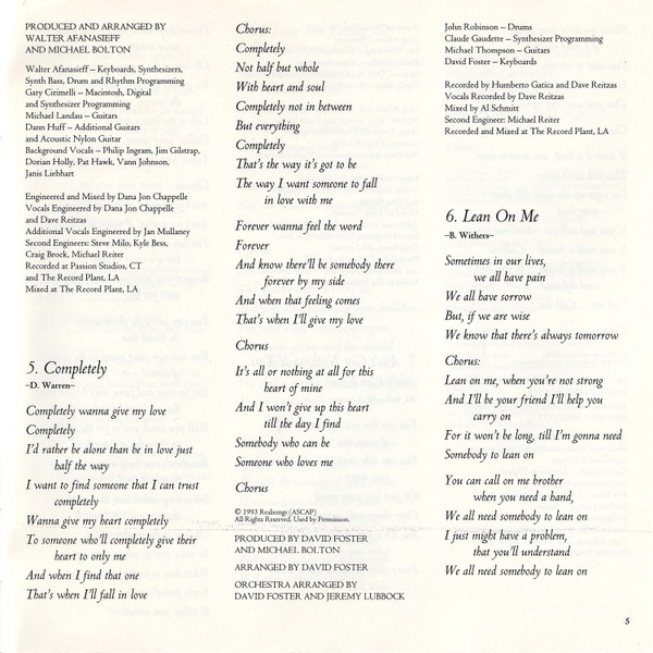 Arranged By – Walter Afanasieff Arranged By – Joey Melotti Backing Vocals – Portia Griffin Backing Vocals – Carmen Twillie Backing Vocals – Vann Johnson Backing Vocals – Janis Liebhart Backing Vocals – Pat Hawk Backing Vocals – Mona Lisa Young Backing Vocals – Johnny Britt Backing Vocals – Phil Perry (2) Backing Vocals – Jim Gilstrap Backing Vocals – Dorian Holley Baritone Saxophone – Stephen Kupka Engineer – Dana Jon Chappelle Engineer [Additional Vocals] – Jan Mullaney Engineer [Second] – Steve Milo Engineer [Second] – Bill Leonard Engineer [Second] – Kyle Bess Engineer [Second] – Craig Brock Engineer [Vocals] – David Reitzas Engineer [Vocals] – Dana Jon Chappelle Guitar – Michael Landau Horns – Tower Of Power Horn Section Keyboards, Synthesizer, Synth [Bass], Drum Programming, Programmed By [Rhythm], Organ [Hammond B-3] – Walter Afanasieff Mixed By – Mick Guzauski Producer – Michael Bolton Producer – Walter Afanasieff Programmed By [Macintosh, Synthesizer] – Gary Cirimelli Programmed By [Synthesizer] – Ren Klyce Tenor Saxophone – Emilio Castillo Tenor Saxophone – David Mann Trombone – Lee Thornburg Trumpet – Lee Thornburg Trumpet – Greg Adams Written-By – Bill Withers |