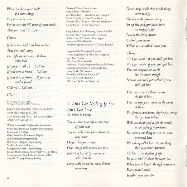 Backing Vocals – Vann Johnson Backing Vocals – Janis Liebhart Backing Vocals – Pat Hawk Backing Vocals – Jim Gilstrap Backing Vocals – Dorian Holley Backing Vocals – Phillip Ingram Engineer [Additional Vocals] – Jan Mullaney Engineer [Second] – Steve Milo Engineer [Second] – Kyle Bess Engineer [Second] – Michael Reiter Engineer [Second] – Craig Brock Engineer [Vocals] – David Reitzas Engineer [Vocals] – Dana Jon Chappelle Engineer, Mixed By – Dana Jon Chappelle Guitar – Michael Landau Guitar [Additional], Acoustic Guitar [Nylon] – Dann Huff Keyboards, Synthesizer, Synth [Bass], Drum Programming, Programmed By [Rhythm] – Walter Afanasieff Producer, Arranged By – Michael Bolton Producer, Arranged By – Walter Afanasieff Programmed By [Macintosh, Digital, Synthesizer] – Gary Cirimelli Written-By – Michael Bolton Written-By – Diane Warren Written-By – Walter Afanasieff |