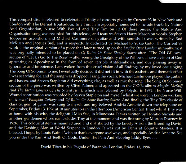 Current 93 Guitar, Bass Guitar – Michael Cashmore Performer [Everything Else], Mixed By – Steven Stapleton Vocals – David Tibet |