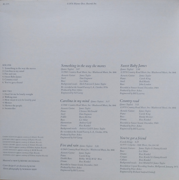 Acoustic Guitar – James Taylor (2) Bass – Leland Sklar Bells [Orchestra], Vibraphone [Vibes] – Victor Feldman Drums – Russ Kunkel Electric Piano [Fender Rhodes] – Clarence McDonald Engineer – Lee Herschberg Harmony Vocals – James Taylor (2) Harmony Vocals – Carly Simon Organ [Hornorgan] – Nick DeCaro Organ [Hornorgan] – Clarence McDonald Organ [Voiceorga] – Nick DeCaro Percussion – Russ Kunkel Producer – Russ Titelman Producer – Lenny Waronker |