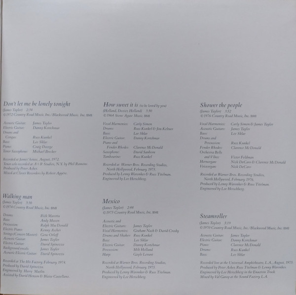 Acoustic Guitar – James Taylor (2) Bass – Leland Sklar Drums, Congas – Russ Kunkel Electric Guitar – Danny Kortchmar Mixed By – Robert Appère Piano – Craig Doerge Producer – Peter Asher Recorded By [Tenor Solo] – Phil Ramone Tenor Saxophone – Michael Brecker |