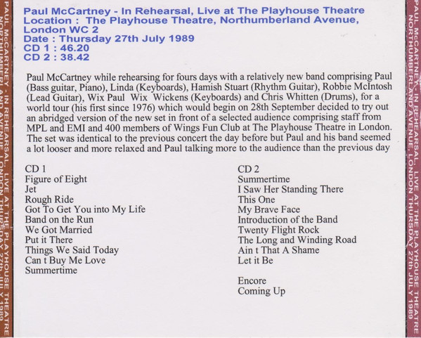 Paul McCartney – In Rehearsal, Live At The Playhouse Theatre, Thursday 27th July 1989
