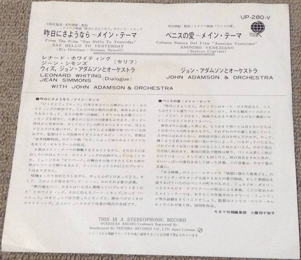 John Adamson And Orchestra – Say Hello To Yesterday = 昨日にさようなら / Anonimo Veneziano = ベニスの愛