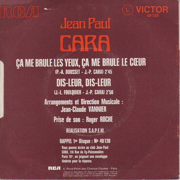 Jean Paul Cara – Ca Me Brûle Les Yeux, Ca Me Brûle Le Coeur