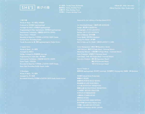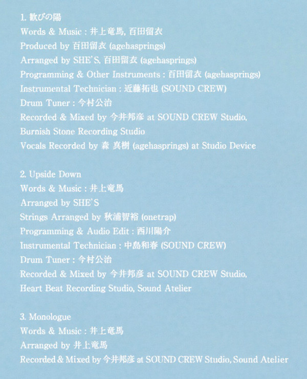 Arranged By – She's (2) Arranged By [Strings] – Tomohiro Akiura Programmed By, Edited By [Audio Edit] – Yosuke Nishikawa Technician [Drum Tuner] – Koji Imamura Technician [Instrumental] – Kazuharu Nakajima |