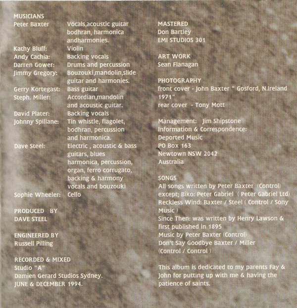 - Vocals, Acoustic Guitar, Bodhrán, Harmonica, Harmony Vocals – Peter Baxter (5)