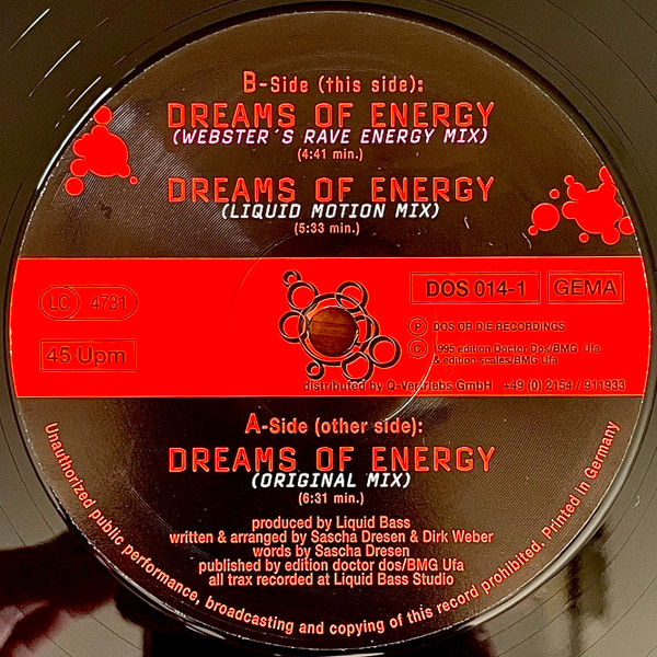 - Matrix / Runout Side A (etched): DREAMS OF ENERGY - A1