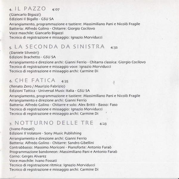 Arranged By [Strings], Directed By [Strings] – Gianni Ferrio Bandoneon, Programmed By – Massimiliano Pani Bandoneon, Programmed By – Antonio Faraò Contrabass – Massimo Moriconi Drums – Alfredo Golino Guitar – Sandro Gibellini Horn – Gerges Alvarez Piano – Antonio Faraò Recorded By [Ritmica] – Ignazio Morviducci Recorded By, Mixed By [Strings] – Carmine Di Voice [Male] – Ivano Fossati Written-By – Ivano Fossati |