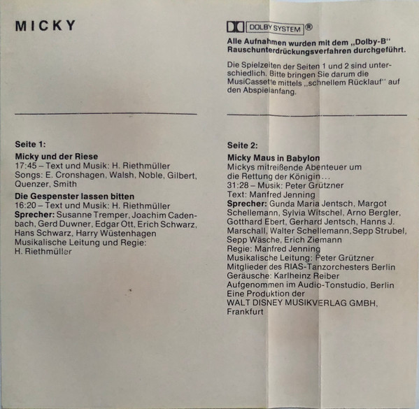 Music Director [Musikalische Leitung], Directed By [Regie] – Heinrich Riethmüller Text By [Text], Music By [Musik] – Heinrich Riethmüller Voice Actor – Edgar Ott Voice Actor – Gerd Duwner Voice Actor – Joachim Cadenbach Voice Actor – Susanne Tremper Voice Actor – Harry Wüstenhagen Written-By [Songs] – Paul J. Smith Written-By [Songs] – Arthur Quenzer Written-By [Songs] – Ray Noble Written-By [Songs] – Bill Walsh (2) Written-By [Songs] – Billy Gilbert Written-By [Songs] – Eberhard Cronshagen |