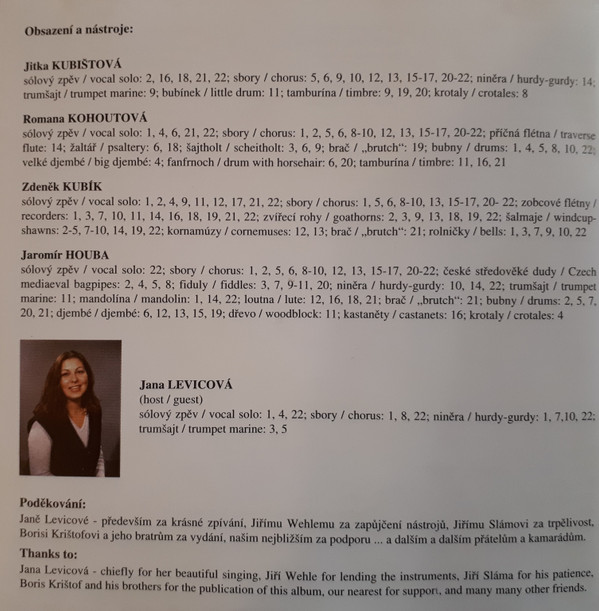 - Solo Vocal, Chorus, Hurdy Gurdy, Lute, Drums, Djembe, Wood Block, Castanets, Crotales, Fiddle, Mandolin – Jaromír Houba
