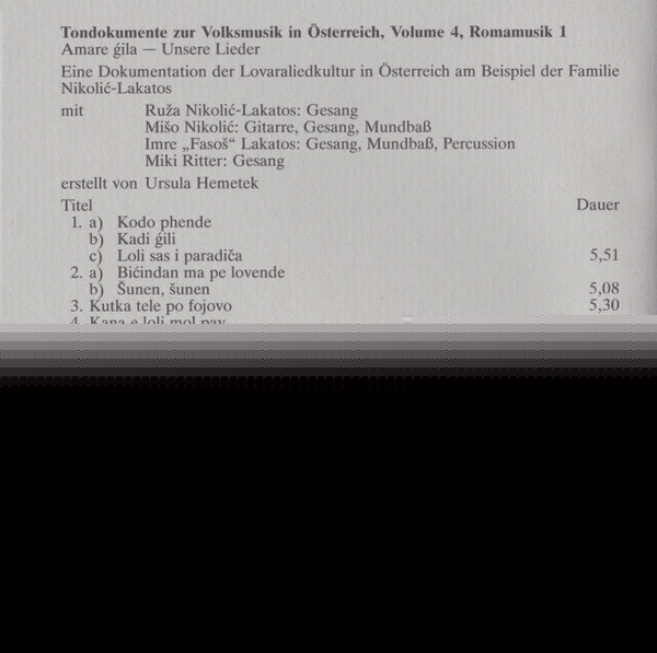 Ruža Nikolić-Lakatos – Tondokumente Zur Volksmusik In Österreich Vol. 4, Romamusik - Amare ģila - Unsere Lieder 1