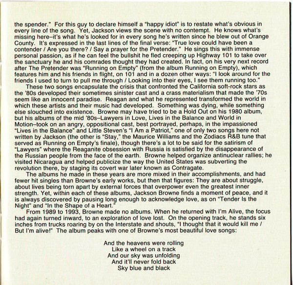 Bass, Acoustic Guitar – Kevin McCormick Drums – Mauricio Lewak Guitar – Mark Goldenberg Guitar, Harmony Vocals – Scott Thurston Organ [Hammond] – Jeff Young (2) Percussion – Luis Conte Twelve-String Guitar [Electric] – Mike Campbell Vocals, Acoustic Guitar – Jackson Browne |