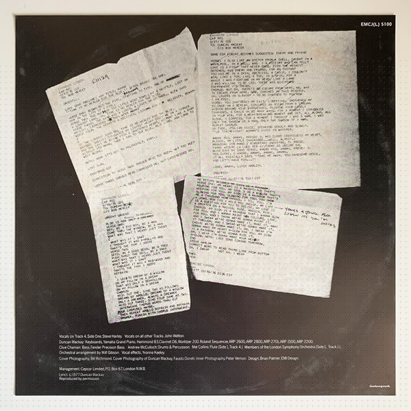 - Keyboards, Grand Piano [Yamaha], Electric Organ [Hammond B3], Clavinet [D6], Electric Piano [Wurlitzer 200], Sequencer [Roland], Synthesizer [Arp 2600, Arp 2800, Arp 2701, Arp 2100, Arp 2200] – Duncan Mackay
