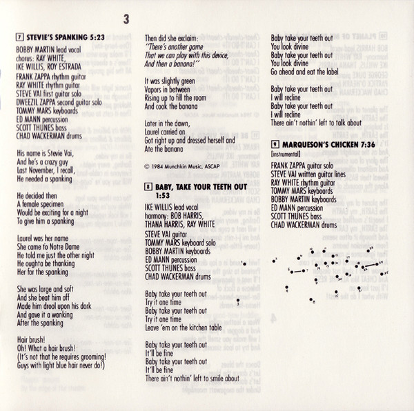 Bass – Scott Thunes Drums – Chad Wackerman Guitar [Written Lines] – Steve Vai Keyboards – Bobby Martin (2) Keyboards – Tommy Mars Percussion – Ed Mann Rhythm Guitar – Ray White Soloist [Guitar] – Frank Zappa |