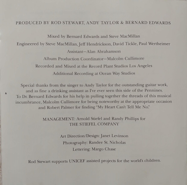 Backing Vocals – Lyn Collins Backing Vocals – Bobby Sheen Backing Vocals – Rita Johnson Bass – Bernard Edwards Drums – Tony Thompson (2) Guitar – Michael Landau Guitar – Andy Taylor Mandolin – David Lindley Organ – William Smith (2) Piano – Bill Payne Soloist, Guitar – Andy Taylor Written-By – Rod Stewart Written-By – Andy Taylor |