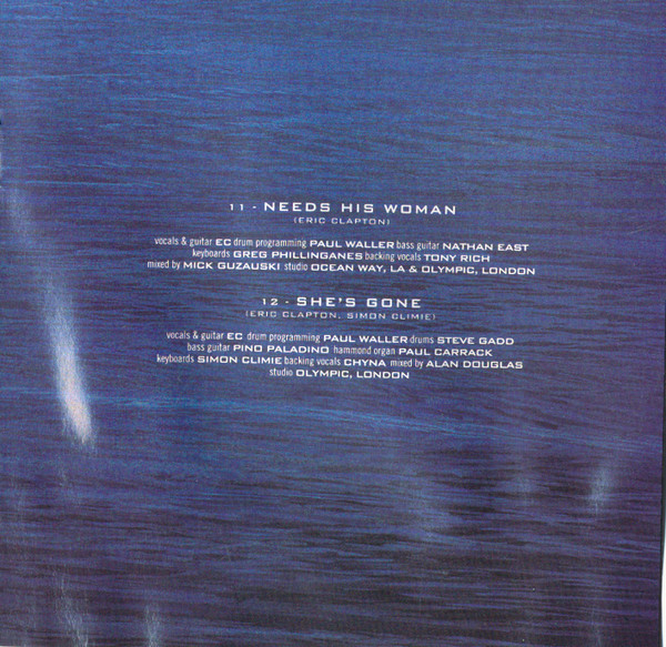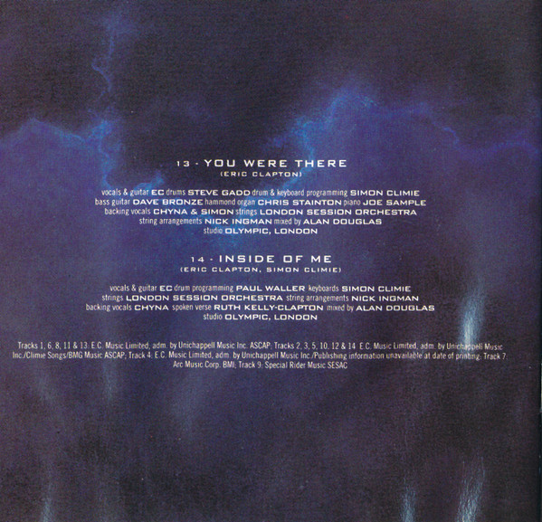 Arranged By [String Arrangements] – Nick Ingman Backing Vocals – Simon Climie Backing Vocals – Chyna Bass Guitar – Dave Bronze Drum Programming, Programmed By [Keyboards] – Simon Climie Drums – Steve Gadd Mixed By – Alan Douglas (2) Organ [Hammond Organ] – Chris Stainton Piano – Joe Sample Strings – The London Session Orchestra Vocals, Guitar – Eric Clapton Written-By – Eric Clapton |