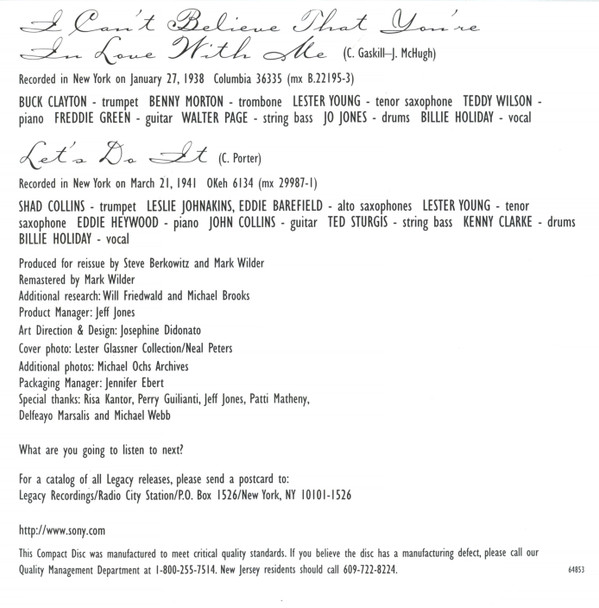 Acoustic Bass [String Bass] – Walter Page Clarinet – Buster Bailey Drums – Jo Jones Guitar – Freddie Green Piano – Teddy Wilson Tenor Saxophone – Lester Young Trumpet – Buck Clayton Written-By – Ralph Rainger Written-By – Leo Robin |