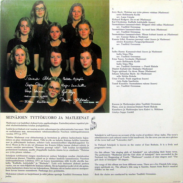 Seinäjoen Tyttökuoro Matleenat Arranged By – Tuulikki Orrenmaa Flute – Sirpa Piha Written-By – Sulho Ranta |