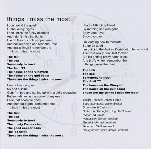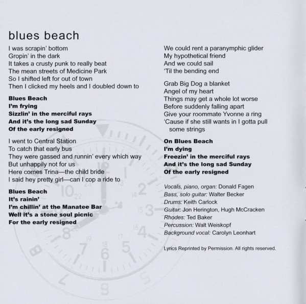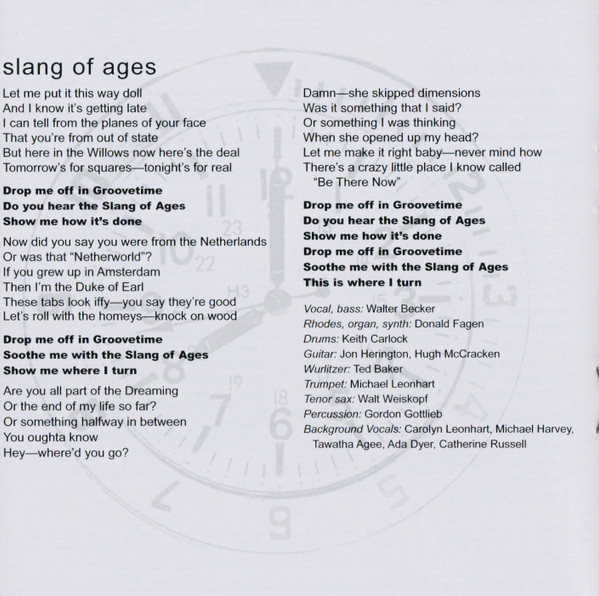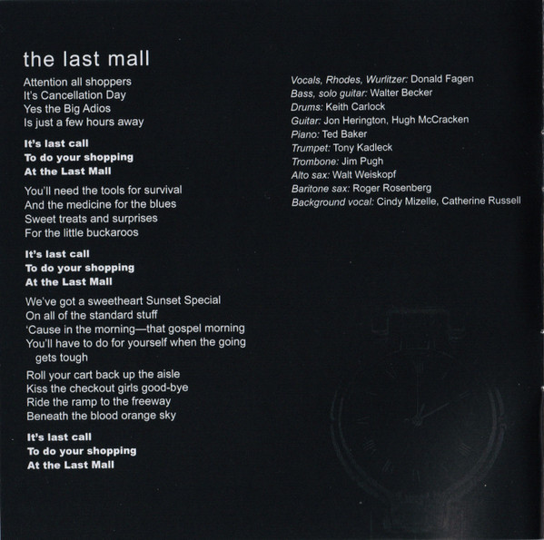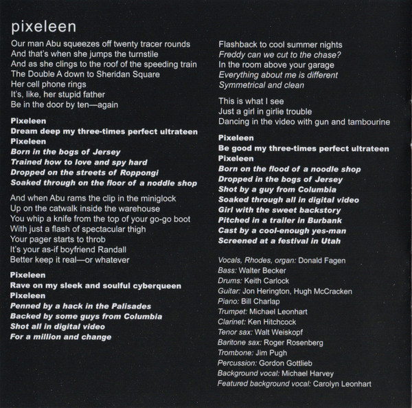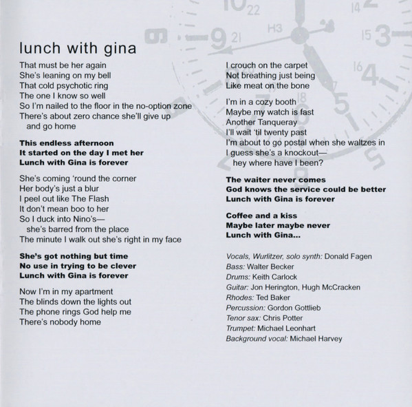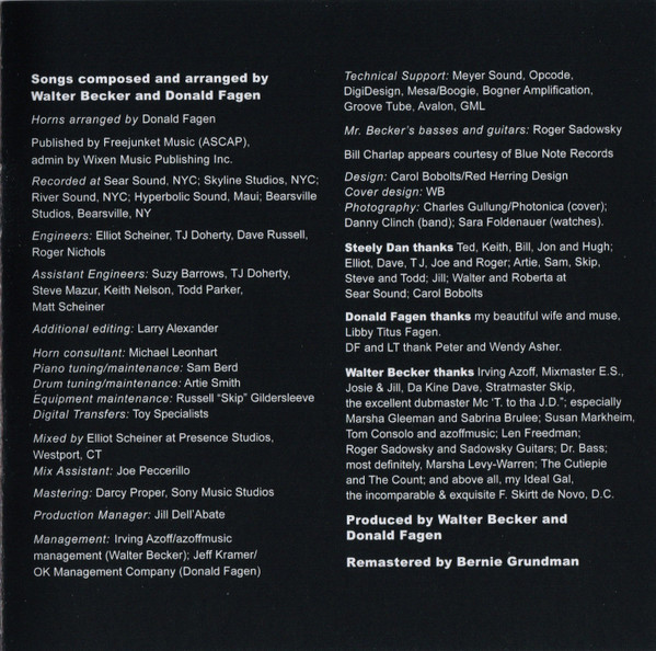 Backing Vocals – Carolyn Leonhart Bass, Guitar, Soloist – Walter Becker Drums – Keith Carlock Guitar – Hugh McCracken Guitar – Jon Herington Percussion – Gordon Gottlieb Piano – Ted Baker Tenor Saxophone – Walt Weiskopf Trumpet – Michael Leonhart Vocals, Electric Piano [Rhodes] – Donald Fagen |