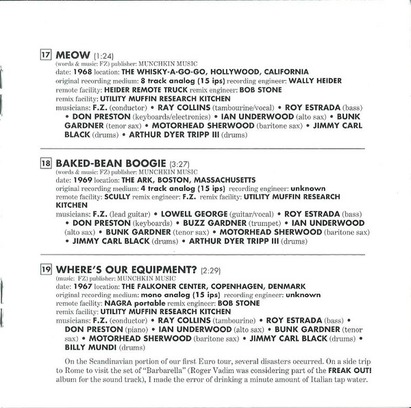 Alto Saxophone – Ian Underwood Baritone Saxophone, Vocals – Motorhead Sherwood Bass, Vocals [Lunatic] – Roy Estrada Drums, Vocals – Art Tripp Drums, Vocals – Jimmy Carl Black Guitar [Guitar Fx], Conductor – Frank Zappa Guitar [Guitar Fx], Vocals – Lowell George Keyboards, Electronics, Tape [Tape Playback] – Don Preston Music By – Frank Zappa Tenor Saxophone, Vocals, Recorded By [Documentary Recordist] – Bunk Gardner Trumpet – Buzz Gardner Words By – Roy Estrada |