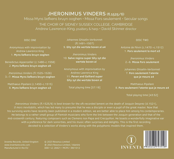 Jheronimus Vinders – Missa Myns Liefkens Bruyn Ooghen; Missa Fors Seulement; Secular Songs