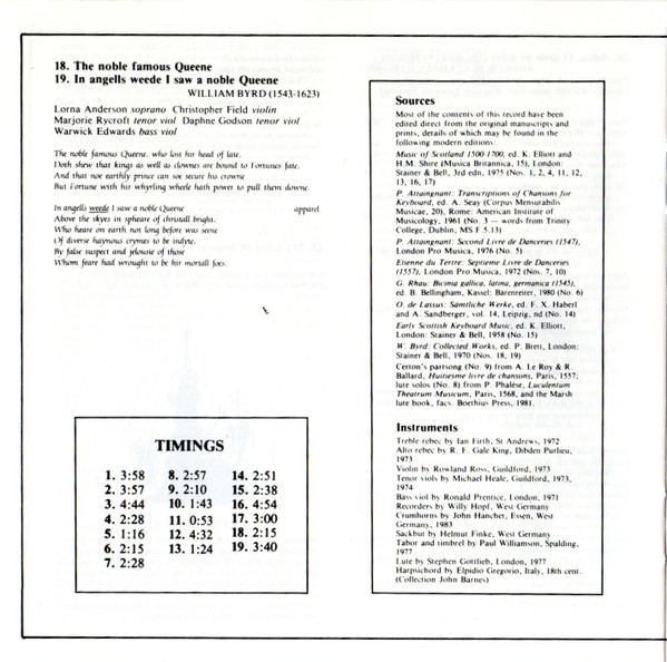 Rebec [Treble Rebec] – Christopher Field Recorder [Descant Recorder] – Jennifer Hill (3) Tambourine [Timbrel] – Alan Oke Viol [Bass Viol] – Warwick Edwards Viol [Tenor Viol] – Marjorie Rycroft |