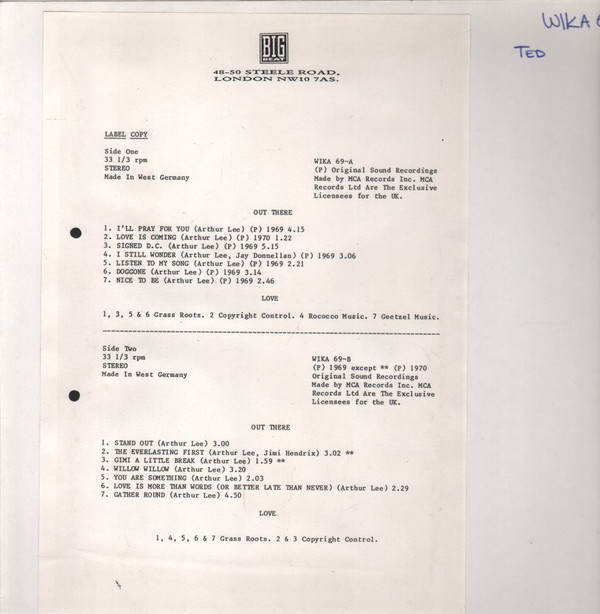 - Piano tracks A2, B1, B3 – Arthur Lee