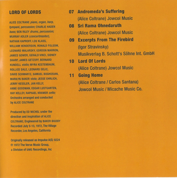 Bass – Charlie Haden Cello – Jan Kelley Cello – Jesse Ehrlich Cello – Raphael Kramer Cello – Anne Goodman Cello – Edgar Lustgarten (2) Cello – Ray Kelley Cello – Jerome Kessler Concertmaster – Murray Adler Drums, Percussion – Ben Riley Viola – Rollice Dale Viola – David Schwartz Viola – Myra Kestenbaum Viola – Marilyn Baker Viola – Leonard Selic Viola – Samuel Boghossian Violin – Gerald Vinci Violin – James Getzoff Violin – Bernard Kundell Violin – Nathan Kaproff Violin – William Henderson (2) Violin – Lou Klass Violin – Janice Gower Violin – Leonard Malarsky Violin – Gordon Marron Violin – Sidney Sharp Violin – Ronald Folsom Written-By, Piano, Organ, Harp, Timpani [Tympani], Percussion, Arranged By [Orchestra], Conductor – Alice Coltrane |