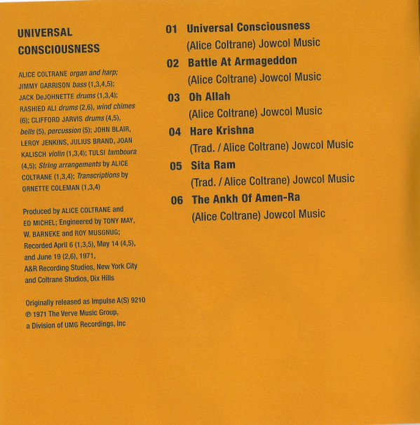 Bass – Jimmy Garrison Drums, Bells, Percussion – Clifford Jarvis Organ, Harp – Alice Coltrane Tambura [Tamboura] – Tulsi Written-By – Alice Coltrane Written-By – Traditional |