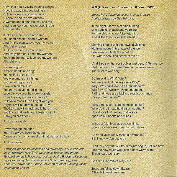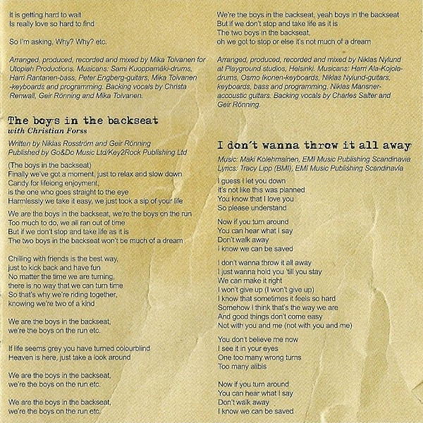 Geir Rønning Arranged By [Strings] – Mikael Svarvar Arranged By [Strings] – Jimmy Westerlund Arranged By, Producer – Jimmy Westerlund Backing Vocals – Charles Salter Backing Vocals – Anna-Maija Jalkanen Backing Vocals – Geir Rønning Bass – Marcus Söderström Drums – Per Lindvall Guitar, Programmed By – Niklas Nylund Guitar, Programmed By – Jimmy Westerlund Keyboards – Gunnar Touraknul Lyrics By – Geir Rønning Lyrics By – Jimmy Westerlund Lyrics By – Fredrik Furu Music By – Jimmy Westerlund Producer [Additional], Recorded By [Additional] – Niklas Nylund Producer [Additional], Recorded By [Additional] – Svante Forsbäck Recorded By – Anders Höglund Strings – Liisa Luhtanen Strings – Anna-Maria Helsing Strings – Beata Biernikiewicz Strings – Katja Peltonen |