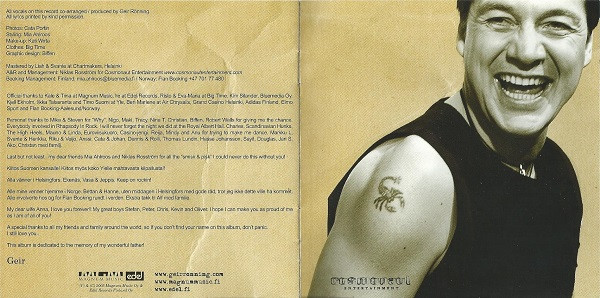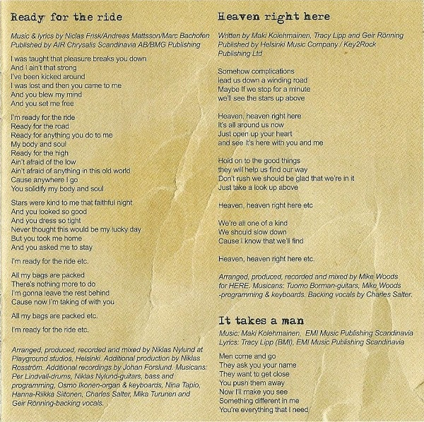 Geir Rønning Arranged By, Producer, Recorded By, Mixed By – Aku Sinivalo Arranged By, Producer, Recorded By, Mixed By – Jukka Backlund Backing Vocals – Jeanette Olsson Bass, Programmed By – Aku Sinivalo Drums – Teijo Jämsä Guitar – Tuomo Borman Guitar – Tracy Lipp Keyboards, Programmed By – Jukka Backlund Lyrics By – Tracy Lipp Music By – Maki Kolehmainen Saxophone – Aleksi Ahoniemi Trumpet – Janne Toivonen |