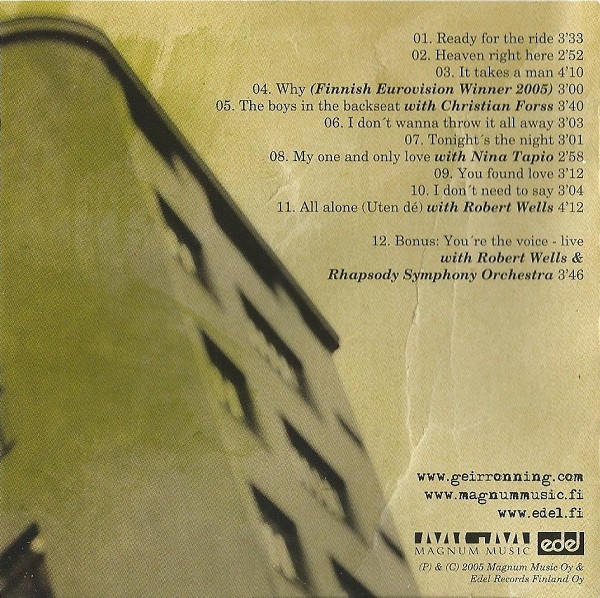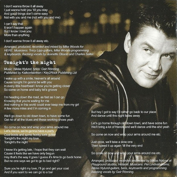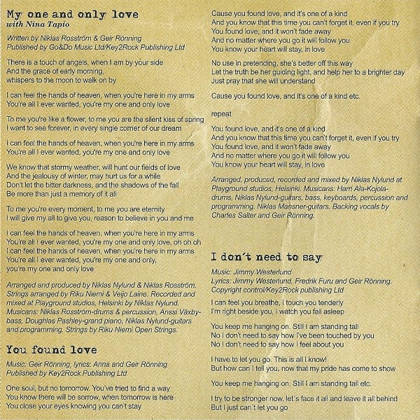 Geir Rønning Christian Forss Acoustic Guitar – Niklas Mansner Arranged By, Producer, Recorded By, Mixed By – Niklas Nylund Backing Vocals – Charles Salter Backing Vocals – Geir Rønning Drums – Harri Ala-Kojola Guitar, Keyboards, Bass, Programmed By – Niklas Nylund Keyboards – Osmo Ikonen Written-By – Geir Rønning Written-By – Niklas Rosström |