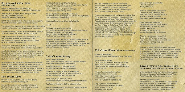 Geir Rønning Nina Tapio Arranged By [Strings] – Veijo Laine Arranged By [Strings] – Riku Niemi Arranged By, Producer – Niklas Nylund Arranged By, Producer – Niklas Rosström Bass – Anssi Växby Drums, Percussion – Niklas Rosström Grand Piano – Douglas Pashley Guitar, Programmed By – Niklas Nylund Recorded By, Mixed By – Niklas Nylund Strings – Riku Niemi & Open Strings Written-By – Geir Rønning Written-By – Niklas Rosström |