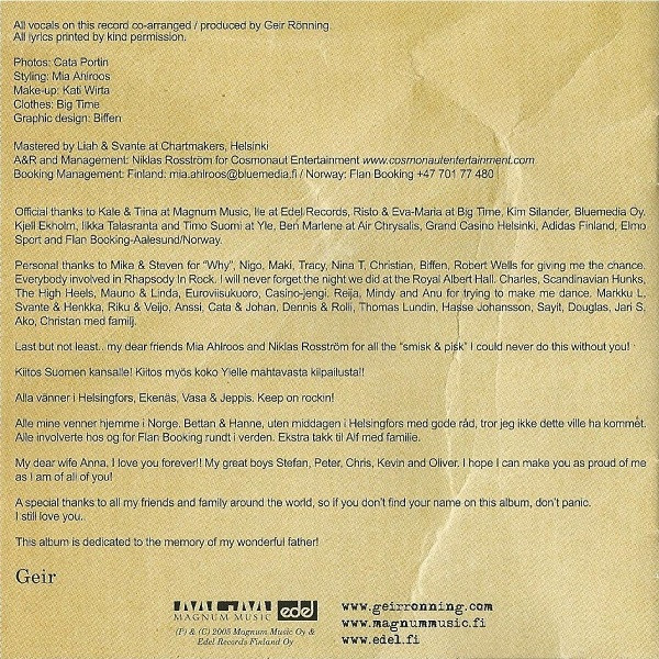 Geir Rønning Arranged By, Producer, Recorded By, Mixed By – Niklas Nylund Backing Vocals – Charles Salter Backing Vocals – Geir Rønning Drums – Harri Ala-Kojola Guitar – Niklas Mansner Guitar, Bass, Keyboards, Percussion, Programmed By – Niklas Nylund Lyrics By – Geir Rønning Lyrics By – Anna Rönning Music By – Geir Rønning |