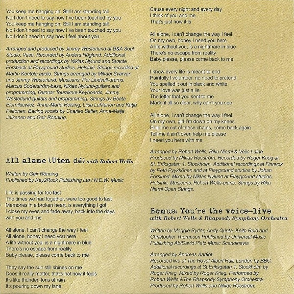 Geir Rønning Robert Wells (3) Arranged By – Robert Wells (3) Arranged By – Veijo Laine Arranged By – Riku Niemi Mixed By – Niklas Nylund Piano – Robert Wells (3) Producer – Niklas Rosström Recorded By – Roger Krieg Recorded By [Additional] – Petri Pyykkönen Recorded By [Additional] – Johan Forslund Strings – Riku Niemi & Open Strings Written-By – Geir Rønning |