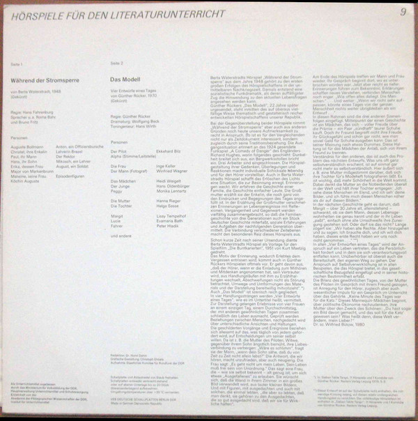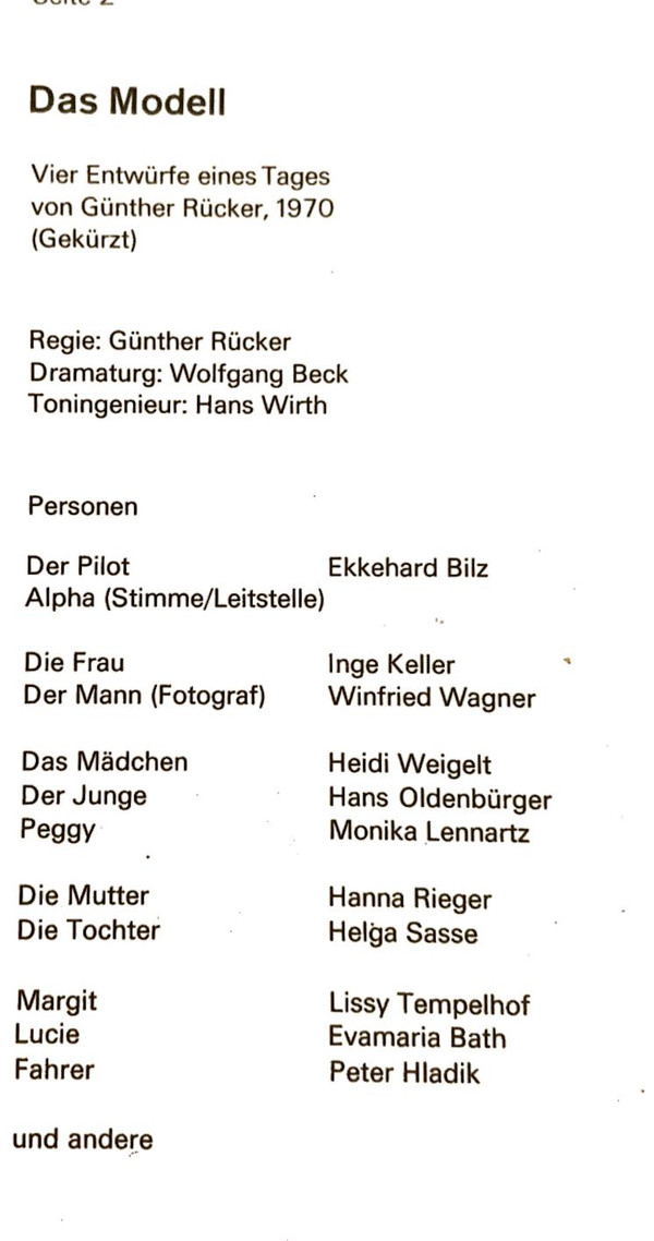 Directed By – Günther Rücker Engineer – Hans Wirth Voice Actor [Das Mädchen] – Heidi Weigelt Voice Actor [Der Junge] – Hans Oldenbürger Voice Actor [Der Mann (Fotograf)] – Winfried Wagner Voice Actor [Der Pilot / Alpha / Stimme Leitstelle] – Ekkehard Bilz Voice Actor [Die Frau] – Inge Keller Voice Actor [Die Mutter] – Hanna Rieger Voice Actor [Die Tochter] – Helga Sasse Voice Actor [Fahrer] – Peter Hladik Voice Actor [Lucie] – Evamaria Bath Voice Actor [Margit] – Lissy Tempelhof Voice Actor [Peggy] – Monika Lennartz Written-By – Günther Rücker |