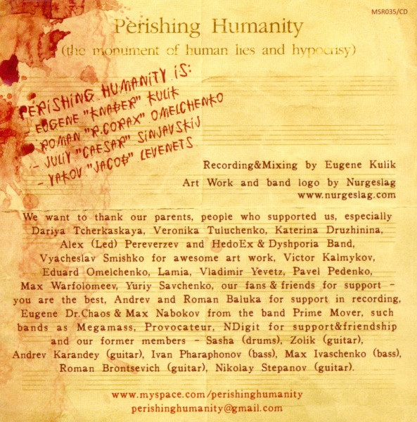 - Matrix / Runout Matrix dark-ring: PERISHING HUMANITY THE MONUMENT OF HUMAN LIES AND HYPOCRISY