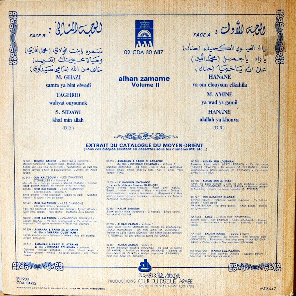 | Лейбл: | Les Artistes Arabes Associés – 02 CDA 80 687 Les Artistes Arabes Associés – 80 687 Club Du Disque Arabe – 02 CDA 80 687 Club Du Disque Arabe – 80 687 |