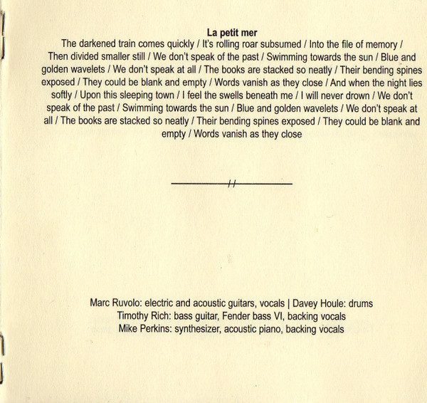 Bass Guitar, Backing Vocals – Timothy Rich Drums – Davey Houle Electric Guitar, Acoustic Guitar, Lead Vocals – Marc Ruvolo Synthesizer, Piano, Backing Vocals – Mike Perkins |