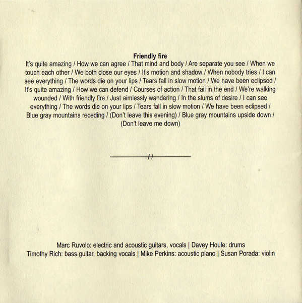 Acoustic Guitar, Electric Guitar, Lead Vocals – Marc Ruvolo Bass Guitar, Backing Vocals – Timothy Rich Drums – Davey Houle Piano – Mike Perkins Violin – Susan Porada |