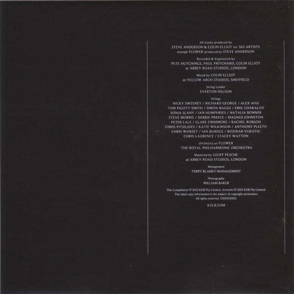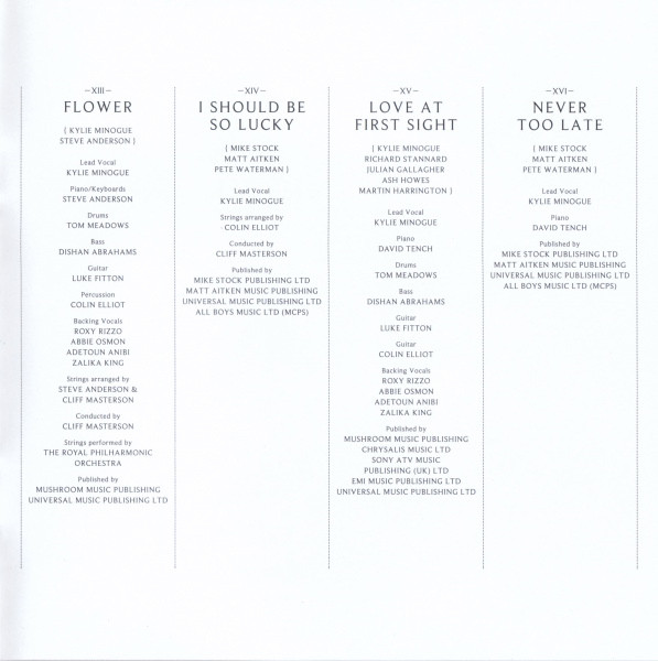 Arranged By [Strings] – Cliff Masterson Arranged By [Strings] – Steve Anderson Backing Vocals – Abbie Osmon Backing Vocals – Adetoun Anibi Backing Vocals – Roxanne Wilde Backing Vocals – Zalika King Bass – Dishan Abrahams Conductor – Cliff Masterson Drums – Tom Meadows Guitar – Luke Fitton Lead Vocals – Kylie Minogue Percussion – Colin Elliot Piano, Keyboards – Steve Anderson Strings – The Royal Philharmonic Orchestra Written-By – Kylie Minogue Written-By – Steve Anderson |