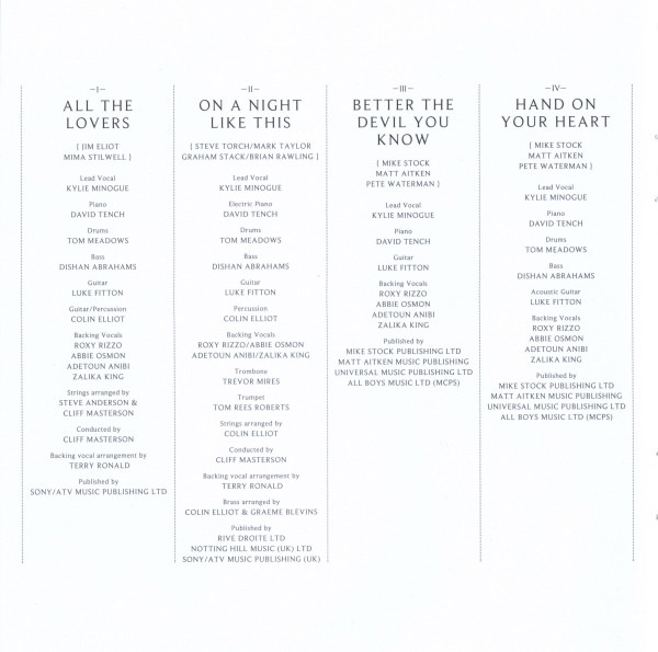 Arranged By [Brass] – Graeme Blevins Arranged By [Brass] – Colin Elliot Arranged By [Strings] – Colin Elliot Backing Vocals – Abbie Osmon Backing Vocals – Adetoun Anibi Backing Vocals – Roxanne Wilde Backing Vocals – Zalika King Bass – Dishan Abrahams Conductor – Cliff Masterson Drums – Tom Meadows Electric Piano – David Tench Guitar – Luke Fitton Lead Vocals – Kylie Minogue Percussion – Colin Elliot Trombone – Trevor Mires Trumpet – Tom Rees-Roberts Written-By – Graham Stack Written-By – Mark Taylor Written-By – Steve Torch Written-By – Brian Rawling |