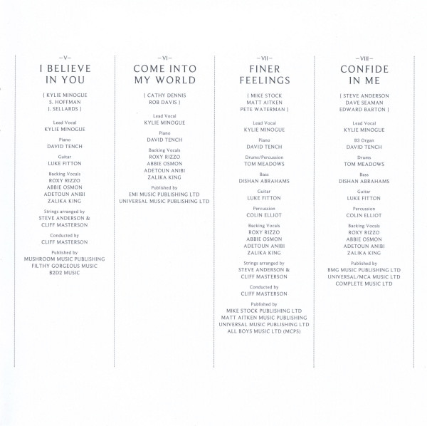 Arranged By [Strings] – Cliff Masterson Arranged By [Strings] – Steve Anderson Backing Vocals – Abbie Osmon Backing Vocals – Adetoun Anibi Backing Vocals – Roxanne Wilde Backing Vocals – Zalika King Bass – Dishan Abrahams Conductor – Cliff Masterson Drums – Tom Meadows Guitar – Luke Fitton Lead Vocals – Kylie Minogue Percussion – Tom Meadows Percussion – Colin Elliot Piano – David Tench Written-By – Stock, Aitken & Waterman |