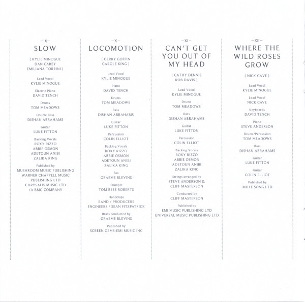 Arranged By [Strings] – Cliff Masterson Arranged By [Strings] – Steve Anderson Backing Vocals – Abbie Osmon Backing Vocals – Adetoun Anibi Backing Vocals – Roxanne Wilde Backing Vocals – Zalika King Bass – Dishan Abrahams Conductor – Cliff Masterson Drums – Tom Meadows Guitar – Luke Fitton Lead Vocals – Kylie Minogue Percussion – Colin Elliot Written-By – Cathy Dennis Written-By – Rob Davis |