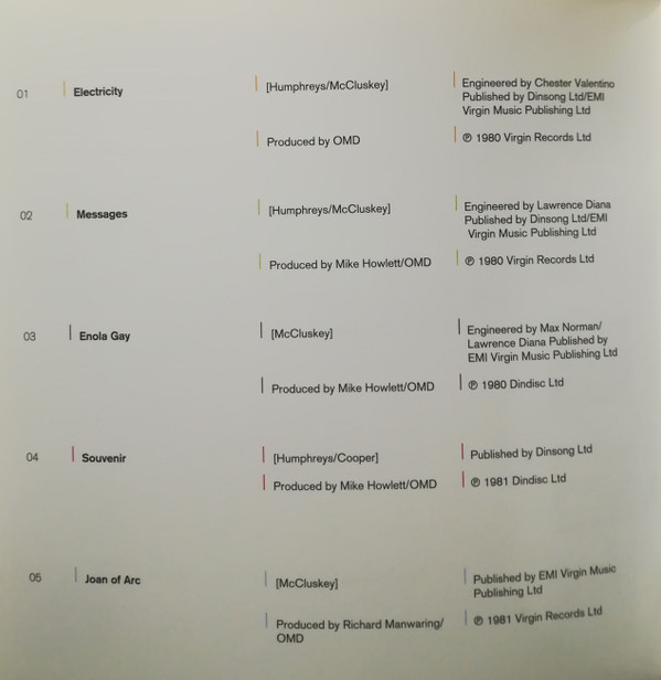 Engineer – Brian Tench Engineer – Ronald Prent Engineer – Steve Jackson (2) Producer – Brian Tench Producer – Orchestral Manoeuvres In The Dark Written-By – Andy McCluskey Written-By – Paul Humphreys Written-By – Martin Cooper (2) |