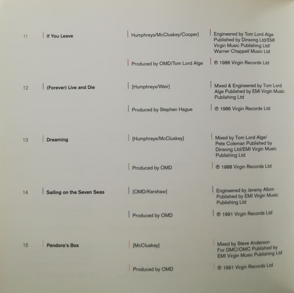 Engineer – Tom Lord-Alge Producer – Tom Lord-Alge Producer – Orchestral Manoeuvres In The Dark Written-By – Andy McCluskey Written-By – Paul Humphreys Written-By – Martin Cooper (2) |